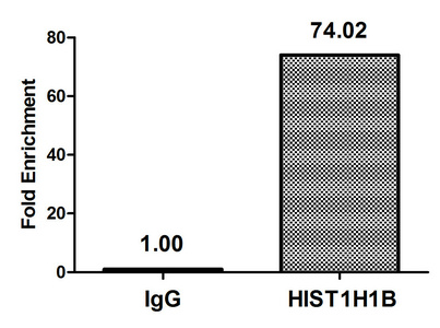 Chromatin Immunoprecipitation Hela (4*106, treated with 30mM sodium butyrate for 4h) were treated with Micrococcal Nuclease, sonicated, and immunoprecipitated with 8µg anti-HIST1H1B (CSB-PA010377PA16acHU) or a control normal rabbit IgG. The resulting ChIP DNA was quantified using real-time PCR with primers against the β-Globin promoter.