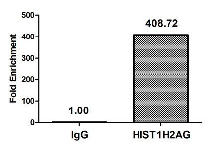 Chromatin Immunoprecipitation Hela (4*106, treated with 30mM sodium butyrate for 4h) were treated with Micrococcal Nuclease, sonicated, and immunoprecipitated with 8µg anti-HIST1H2AG (CSB-PA010389PA36acHU) or a control normal rabbit IgG. The resulting ChIP DNA was quantified using real-time PCR with primers against the β-Globin promoter.