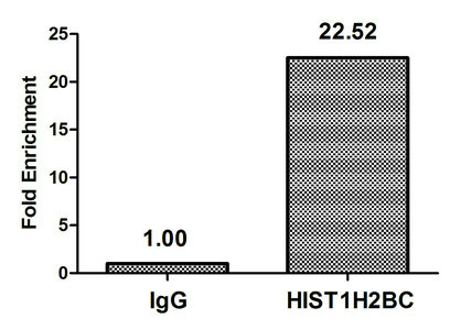 Chromatin Immunoprecipitation Hela (106, treated with 30mM sodium butyrate for 4h) were treated with Micrococcal Nuclease, sonicated, and immunoprecipitated with 5µg anti-HIST1H2BC (CSB-PA010403OA120acHU) or a control normal rabbit IgG. The resulting ChIP DNA was quantified using real-time PCR with primers against the β-Globin promoter.