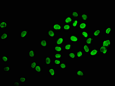 Immunofluorescence staining of Hela cells (treated with 30mM sodium butyrate for 4h) with CSB-PA010403OA120acHU at 1:2.5, counter-stained with DAPI. The cells were fixed in 4% formaldehyde, permeabilized using 0.2% Triton X-100 and blocked in 10% normal Goat Serum. The cells were then incubated with the antibody overnight at 4°C. The secondary antibody was Alexa Fluor 488-congugated AffiniPure Goat Anti-Rabbit IgG(H+L).