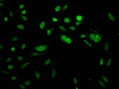 Immunofluorescence staining of Hela cells with CSB-PA010418OA64acHU at 1:5, counter-stained with DAPI. The cells were fixed in 4% formaldehyde, permeabilized using 0.2% Triton X-100 and blocked in 10% normal Goat Serum. The cells were then incubated with the antibody overnight at 4°C. The secondary antibody was Alexa Fluor 488-congugated AffiniPure Goat Anti-Rabbit IgG(H+L).