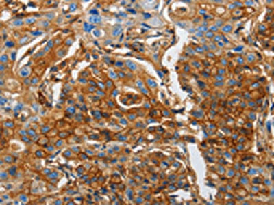 The image on the left is immunohistochemistry of paraffin-embedded Human esophagus cancer tissue using CSB-PA791042(B2M Antibody) at dilution 1/25, on the right is treated with fusion protein. (Original magnification: ×200)