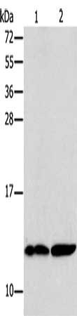 Gel: 15%SDS-PAGE, Lysate: 40 μg, Lane 1-2: Human kidney tissue, Raji cells, Primary antibody: CSB-PA791042(B2M Antibody) at dilution 1/250, Secondary antibody: Goat anti rabbit IgG at 1/8000 dilution, Exposure time: 20 seconds