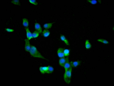 Immunofluorescence staining of SH-SY5Y cells with CSB-PA883639LA01HU at 1:66, counter-stained with DAPI. The cells were fixed in 4% formaldehyde, permeabilized using 0.2% Triton X-100 and blocked in 10% normal Goat Serum. The cells were then incubated with the antibody overnight at 4°C. The secondary antibody was Alexa Fluor 488-congugated AffiniPure Goat Anti-Rabbit IgG(H+L).
