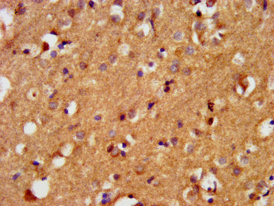 IHC image of CSB-PA002547LA01HU diluted at 1:400 and staining in paraffin-embedded human brain tissue performed on a Leica BondTM system. After dewaxing and hydration, antigen retrieval was mediated by high pressure in a citrate buffer (pH 6.0). Section was blocked with 10% normal goat serum 30min at RT. Then primary antibody (1% BSA) was incubated at 4°C overnight. The primary is detected by a biotinylated secondary antibody and visualized using an HRP conjugated SP system.