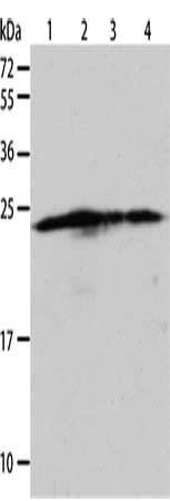 Gel: 12%SDS-PAGE, Lysate: 40 μg, Lane 1-4: Hela cells, A431 cells, 293T cells, Jurkat cells, Primary antibody: CSB-PA089402(BAK1 Antibody) at dilution 1/900, Secondary antibody: Goat anti rabbit IgG at 1/8000 dilution, Exposure time: 5 seconds