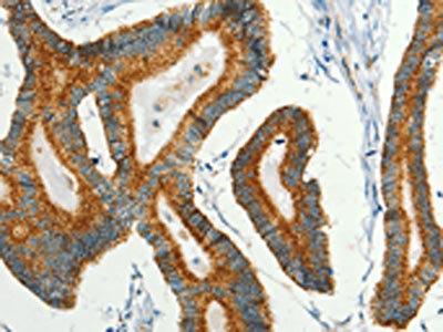The image on the left is immunohistochemistry of paraffin-embedded Human thyroid cancer tissue using CSB-PA129399(BCAT2 Antibody) at dilution 1/50, on the right is treated with fusion protein. (Original magnification: ×200)