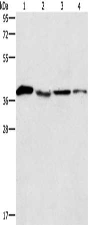 Gel: 12%SDS-PAGE, Lysate: 40 μg, Lane 1-4: Human placenta tissue, NIH/3T3 cells, Raji cells, hepG2 cells, Primary antibody: CSB-PA129399(BCAT2 Antibody) at dilution 1/250, Secondary antibody: Goat anti rabbit IgG at 1/8000 dilution, Exposure time: 5 seconds