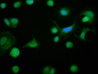 Immunofluorescence staining of MCF-7 cells with CSB-PA002613HA01HU at 1:133, counter-stained with DAPI. The cells were fixed in 4% formaldehyde, permeabilized using 0.2% Triton X-100 and blocked in 10% normal Goat Serum. The cells were then incubated with the antibody overnight at 4°C. The secondary antibody was Alexa Fluor 488-congugated AffiniPure Goat Anti-Rabbit IgG(H+L).