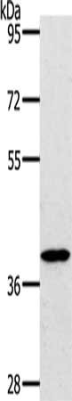 Gel: 10%SDS-PAGE, Lysate: 50 μg, Lane: Jurkat cells, Primary antibody: CSB-PA031026(BDKRB2 Antibody) at dilution 1/800, Secondary antibody: Goat anti rabbit IgG at 1/8000 dilution, Exposure time: 1 minute