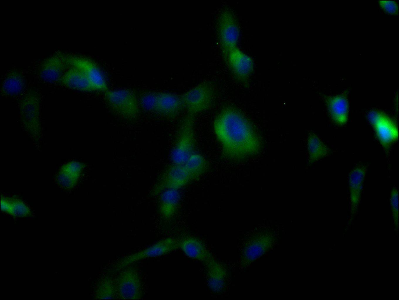 Immunofluorescence staining of U-87 cells with CSB-PA002652LA01HU at 1:100, counter-stained with DAPI. The cells were blocked in 10% normal Goat Serum and incubated with the antibody overnight at 4°C. Nuclear DNA was labeled in blue with DAPI. The secondary antibody was Alexa Fluor 488-congugated AffiniPure Goat Anti-Rabbit IgG(H+L).
