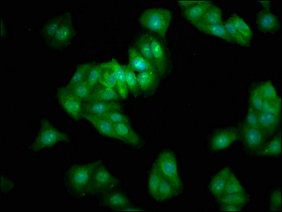 Immunofluorescence staining of HepG2 cells with CSB-PA883628LA01HU at 1:333, counter-stained with DAPI. The cells were fixed in 4% formaldehyde, permeabilized using 0.2% Triton X-100 and blocked in 10% normal Goat Serum. The cells were then incubated with the antibody overnight at 4°C. The secondary antibody was Alexa Fluor 488-congugated AffiniPure Goat Anti-Rabbit IgG(H+L).