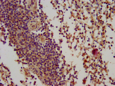 IHC image of CSB-PA002701LA01HU diluted at 1:100 and staining in paraffin-embedded human spleen tissue performed on a Leica BondTM system. After dewaxing and hydration, antigen retrieval was mediated by high pressure in a citrate buffer (pH 6.0). Section was blocked with 10% normal goat serum 30min at RT. Then primary antibody (1% BSA) was incubated at 4°C overnight. The primary is detected by a biotinylated secondary antibody and visualized using an HRP conjugated SP system.
