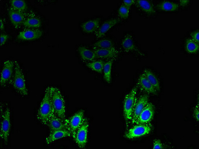 Immunofluorescent analysis of HepG2 cells using CSB-PA00495A0Rb at dilution of 1:100 and Alexa Fluor 488-congugated AffiniPure Goat Anti-Rabbit IgG(H+L)