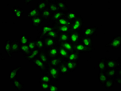 Immunofluorescence staining of Hela cells with CSB-PA867143LA01HU at 1:66, counter-stained with DAPI. The cells were fixed in 4% formaldehyde, permeabilized using 0.2% Triton X-100 and blocked in 10% normal Goat Serum. The cells were then incubated with the antibody overnight at 4°C. The secondary antibody was Alexa Fluor 488-congugated AffiniPure Goat Anti-Rabbit IgG(H+L).