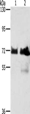 Gel: 6%SDS-PAGE, Lysate: 40 μg, Lane 1-2: Hela cells, Raji cells, Primary antibody: CSB-PA163656(BRAF Antibody) at dilution 1/400, Secondary antibody: Goat anti rabbit IgG at 1/8000 dilution, Exposure time: 1 minute