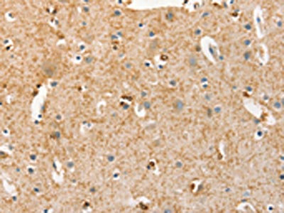 The image on the left is immunohistochemistry of paraffin-embedded Human brain tissue using CSB-PA678542(BRCA1 Antibody) at dilution 1/25, on the right is treated with fusion protein. (Original magnification: ×200)