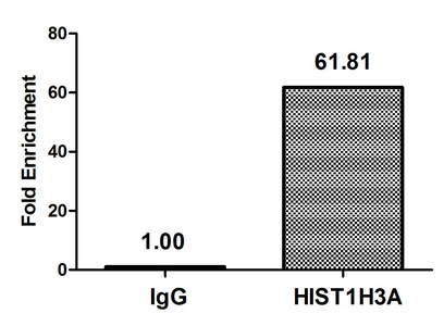 Chromatin Immunoprecipitation Hela (106, treated with 30mM sodium butyrate for 4h) were treated with Micrococcal Nuclease, sonicated, and immunoprecipitated with 5µg anti-HIST1H3A (CSB-PA010418OA23butHU) or a control normal rabbit IgG. The resulting ChIP DNA was quantified using real-time PCR with primers against the β-Globin promoter.