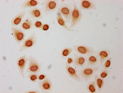 Immunocytochemistry analysis of CSB-PA010418OA09butHU diluted at 1:50 and staining in Hela cells (treated with 30mM sodium butyrate for 4h) performed on a Leica BondTM system. The cells were fixed in 4% formaldehyde, permeabilized using 0.2% Triton X-100 and blocked with 10% normal goat serum 30min at RT. Then primary antibody (1% BSA) was incubated at 4°C overnight. The primary is detected by a biotinylated secondary antibody and visualized using an HRP conjugated SP system.
