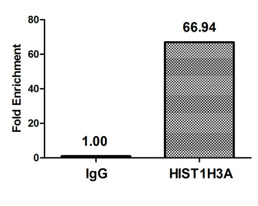 Chromatin Immunoprecipitation Hela (106, treated with 30mM sodium butyrate for 4h) were treated with Micrococcal Nuclease, sonicated, and immunoprecipitated with 5µg anti-HIST1H3A (CSB-PA010418OA09butHU) or a control normal rabbit IgG. The resulting ChIP DNA was quantified using real-time PCR with primers against the β-Globin promoter.