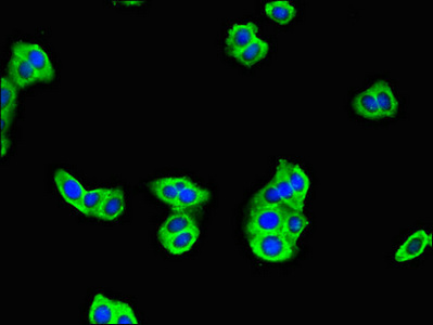 Immunofluorescent analysis of HepG2 cells using CSB-PA643573LA01HU at dilution of 1:100 and Alexa Fluor 488-congugated AffiniPure Goat Anti-Rabbit IgG(H+L)