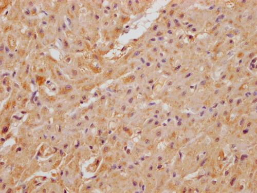 IHC image of CSB-PA761294LA01HU diluted at 1:100 and staining in paraffin-embedded human heart tissue performed on a Leica BondTM system. After dewaxing and hydration, antigen retrieval was mediated by high pressure in a citrate buffer (pH 6.0). Section was blocked with 10% normal goat serum 30min at RT. Then primary antibody (1% BSA) was incubated at 4°C overnight. The primary is detected by a Goat anti-rabbit polymer IgG labeled by HRP and visualized using 0.05% DAB.