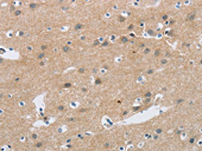 The image on the left is immunohistochemistry of paraffin-embedded Human brain tissue using CSB-PA285697(C2orf40 Antibody) at dilution 1/20, on the right is treated with synthetic peptide. (Original magnification: ×200)