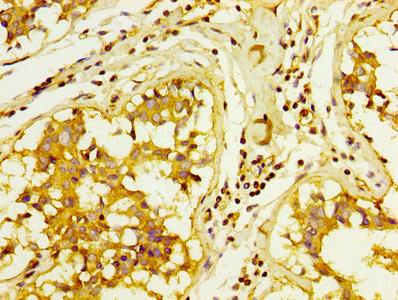 IHC image of CSB-PA10599A0Rb diluted at 1:300 and staining in paraffin-embedded human breast cancer performed on a Leica BondTM system. After dewaxing and hydration, antigen retrieval was mediated by high pressure in a citrate buffer (pH 6.0). Section was blocked with 10% normal goat serum 30min at RT. Then primary antibody (1% BSA) was incubated at 4°C overnight. The primary is detected by a biotinylated secondary antibody and visualized using an HRP conjugated SP system.