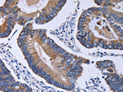 The image on the left is immunohistochemistry of paraffin-embedded Human colon cancer tissue using CSB-PA109564(CA4 Antibody) at dilution 1/30, on the right is treated with fusion protein. (Original magnification: ×200)
