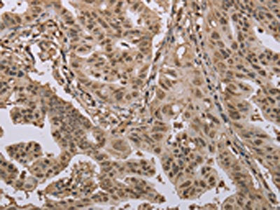 The image on the left is immunohistochemistry of paraffin-embedded Human cervical cancer tissue using CSB-PA782755(CAB39 Antibody) at dilution 1/50, on the right is treated with synthetic peptide. (Original magnification: ×200)