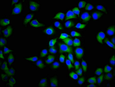 Immunofluorescence staining of Hela cells with CSB-PA615724LA01HU at 1:266, counter-stained with DAPI. The cells were fixed in 4% formaldehyde, permeabilized using 0.2% Triton X-100 and blocked in 10% normal Goat Serum. The cells were then incubated with the antibody overnight at 4°C. The secondary antibody was Alexa Fluor 488-congugated AffiniPure Goat Anti-Rabbit IgG(H+L).