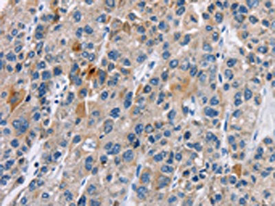 The image on the left is immunohistochemistry of paraffin-embedded Human liver cancer tissue using CSB-PA745307(CACNA1D Antibody) at dilution 1/30, on the right is treated with synthetic peptide. (Original magnification: ×200)