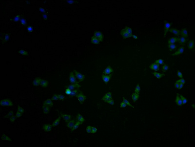 Immunofluorescence staining of Hela cells with CSB-PA892176HA11HU at 1:100, counter-stained with DAPI. The cells were fixed in 4% formaldehyde and blocked in 10% normal Goat Serum. The cells were then incubated with the antibody overnight at 4°C. The secondary antibody was Alexa Fluor 488-congugated AffiniPure Goat Anti-Rabbit IgG(H+L).