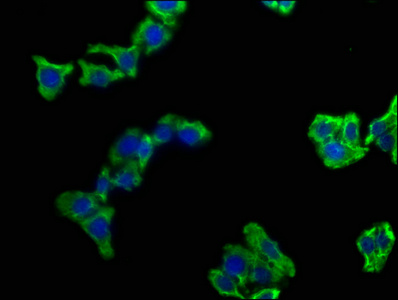 Immunofluorescence staining of HepG2 cells with CSB-PA004469NA01HU at 1:100, counter-stained with DAPI. The cells were fixed in 4% formaldehyde, permeabilized using 0.2% Triton X-100 and blocked in 10% normal Goat Serum. The cells were then incubated with the antibody overnight at 4°C. The secondary antibody was Alexa Fluor 488-congugated AffiniPure Goat Anti-Rabbit IgG(H+L).