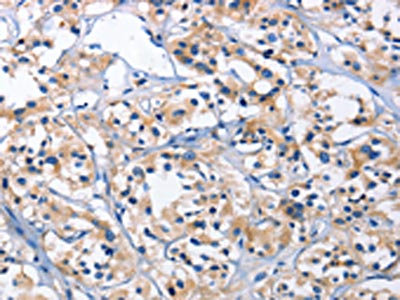 The image on the left is immunohistochemistry of paraffin-embedded Human gastric cancer tissue using CSB-PA102123(CAPZA2 Antibody) at dilution 1/30, on the right is treated with fusion protein. (Original magnification: ×200)