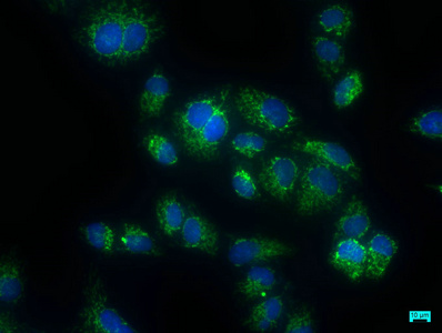 Immunofluorescence staining of Hela cells with CSB-PA682727LA01HU at 1:50, counter-stained with DAPI. The cells were fixed in 4% formaldehyde, permeabilized using 0.2% Triton X-100 and blocked in 10% normal Goat Serum. The cells were then incubated with the antibody overnight at 4°C. The secondary antibody was Alexa Fluor 488-congugated AffiniPure Goat Anti-Rabbit IgG(H+L).