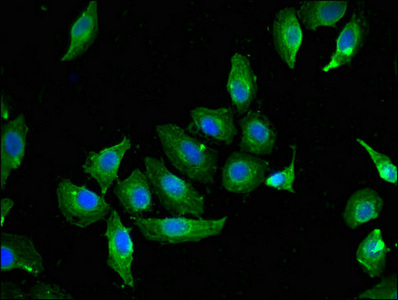 Immunofluorescent analysis of A549 cells using CSB-PA004572LA01HU at dilution of 1:100 and Alexa Fluor 488-congugated AffiniPure Goat Anti-Rabbit IgG(H+L)