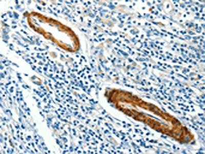 The image on the left is immunohistochemistry of paraffin-embedded Human gastic cancer tissue using CSB-PA057927(CAV3 Antibody) at dilution 1/40, on the right is treated with synthetic peptide. (Original magnification: ×200)