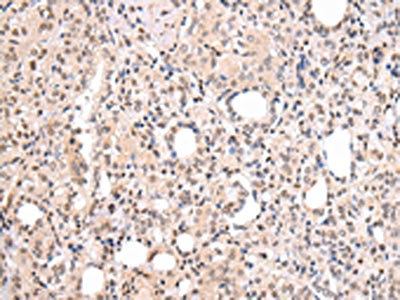 The image on the left is immunohistochemistry of paraffin-embedded Human thyroid cancer tissue using CSB-PA166159(CBX7 Antibody) at dilution 1/20, on the right is treated with synthetic peptide. (Original magnification: ×200)