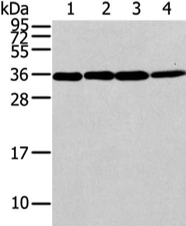 Gel: 12%SDS-PAGE, Lysate: 40 μg, Lane 1-4: Lovo, 293T, Jurkat and hela cell, Primary antibody: CSB-PA166159(CBX7 Antibody) at dilution 1/200 dilution, Secondary antibody: Goat anti rabbit IgG at 1/8000 dilution, Exposure time: 30 seconds