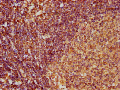 IHC image of CSB-PA896726LA01HU diluted at 1:100 and staining in paraffin-embedded human lymph node tissue performed on a Leica BondTM system. After dewaxing and hydration, antigen retrieval was mediated by high pressure in a citrate buffer (pH 6.0). Section was blocked with 10% normal goat serum 30min at RT. Then primary antibody (1% BSA) was incubated at 4°C overnight. The primary is detected by a biotinylated secondary antibody and visualized using an HRP conjugated SP system.