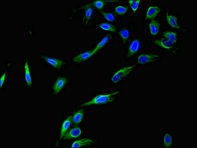 Immunofluorescent analysis of Hela cells using CSB-PA004810LA01HU at dilution of 1:100 and Alexa Fluor 488-congugated AffiniPure Goat Anti-Rabbit IgG(H+L)