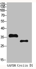 This CCND1 Polyclonal antibody was tested in the WB, IHC and ELISA applications. The non-conjugated IgG was affinity-purified from rabbit antiserum by affinity-chromatography using epitope-specific immunogen. It reacts with the CCND1 proteins of human or mouse or rat-origin and may be used to detect the endogenous levels of CCND1 protein. -