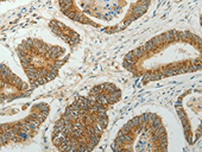 The image on the left is immunohistochemistry of paraffin-embedded Human colon cancer tissue using CSB-PA516472(CCND1 Antibody) at dilution 1/50, on the right is treated with fusion protein. (Original magnification: ×200)