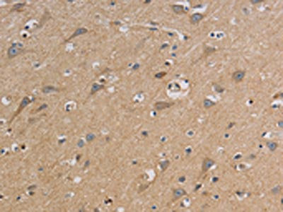 The image on the left is immunohistochemistry of paraffin-embedded Human brain tissue using CSB-PA171419(CCR2 Antibody) at dilution 1/20, on the right is treated with synthetic peptide. (Original magnification: ×200)