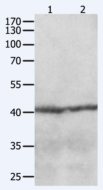 Gel: 10%SDS-PAGE, Lysate: 80 μg, Lane 1-2: Hela cells, K562 cells, Primary antibody: CSB-PA172806(CCR8 Antibody) at dilution 1/200, Secondary antibody: Goat anti rabbit IgG at 1/8000 dilution, Exposure time: 30 seconds