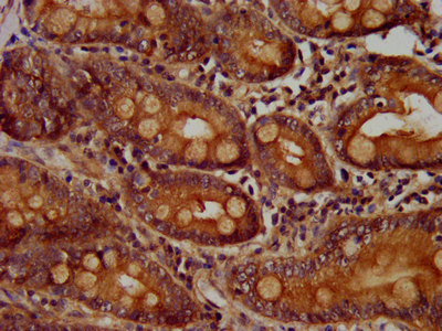 IHC image of CSB-PA004854LA01HU diluted at 1:400 and staining in paraffin-embedded human small intestine tissue performed on a Leica BondTM system. After dewaxing and hydration, antigen retrieval was mediated by high pressure in a citrate buffer (pH 6.0). Section was blocked with 10% normal goat serum 30min at RT. Then primary antibody (1% BSA) was incubated at 4°C overnight. The primary is detected by a biotinylated secondary antibody and visualized using an HRP conjugated SP system.