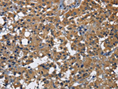 The image on the left is immunohistochemistry of paraffin-embedded Human gastric cancer tissue using CSB-PA787597(CD160 Antibody) at dilution 1/30, on the right is treated with fusion protein. (Original magnification: ×200)