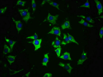 Immunofluorescence staining of SH-SY5Y cells with CSB-PA004895EA01HU at 1:100, counter-stained with DAPI. The cells were fixed in 4% formaldehyde, permeabilized using 0.2% Triton X-100 and blocked in 10% normal Goat Serum. The cells were then incubated with the antibody overnight at 4°C. The secondary antibody was Alexa Fluor 488-congugated AffiniPure Goat Anti-Rabbit IgG(H+L).
