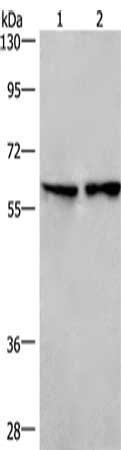Gel: 8%SDS-PAGE, Lysate: 40 μg, Lane 1-2: Lovo cells, mouse lung tissue, Primary antibody: CSB-PA184322(CD244 Antibody) at dilution 1/526, Secondary antibody: Goat anti rabbit IgG at 1/8000 dilution, Exposure time: 1 minute